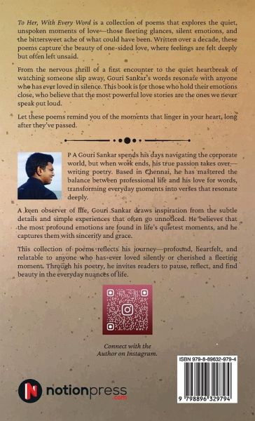 To Her, With Every Word is a collection of poems that explores the quiet, unspoken moments of love-those fleeting glances, silent emotions, and the bittersweet ache of what could have been. Written over a decade, these poems capture the beauty of one-sided love, where feelings are felt deeply but often left unsaid. From the nervous thrill of a first encounter to the quiet heartbreak of watching someone slip away, Gouri Sankar's words resonate with anyone who has ever loved in silence. This book is for those who hold their emotions close, who believe that the most powerful love stories are the ones we never speak out loud. Let these poems remind you of the moments that linger in your heart, long after they've passed.