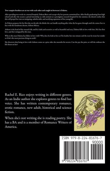 Two vampire brothers are at war with each other and caught in between is Dakota. After spending two weeks in a mental hospital, Dakota Bain can't accept why her parents committed her. After finally graduating from high school and after she secures a prized internship as a lab assistant at a prestigious research hospital for the summer, she doesn't realize that this will propel her into an intriguing, unbelievable, and terrifying experience of her young life. As Dakota prepares for her first day on the job, she thinks she can handle anything after what she has gone through until she comes face to face with the handsome doctor, Ashton Mieras. Ashton is the head of the research lab, and he's dark and secretive as well as beautiful and sexy. Dakota falls in love with him. He's her first love, and she's intrigued by this man. Who is this man Dakota has fallen in love with? Why does he look at her as if he loathes her one minute and the next he treats her tender as if she's the most precious thing on earth? She discovers that being in love with Ashton comes at a price after she unearths his secrets. Can she pay the price, or will she embrace the life thrust on her?