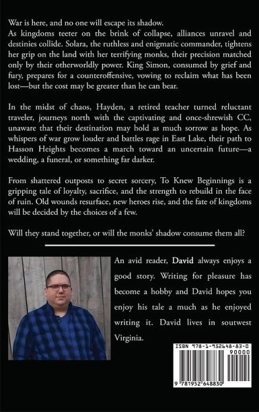 War is here, and no one will escape its shadow. As kingdoms teeter on the brink of collapse, alliances unravel and destinies collide. Solara, the ruthless and enigmatic commander, tightens her grip on the land with her terrifying monks, their precision matched only by their otherworldly power. King Simon, consumed by grief and fury, prepares for a counteroffensive, vowing to reclaim what has been lost-but the cost may be greater than he can bear. In the midst of chaos, Hayden, a retired teacher turned reluctant traveler, journeys north with the captivating and once-shrewish CC, unaware that their destination may hold as much sorrow as hope. As whispers of war grow louder and battles rage in East Lake, their path to Hasson Heights becomes a march toward an uncertain future-a wedding, a funeral, or something far darker. From shattered outposts to secret sorcery, To Knew Beginnings is a gripping tale of loyalty, sacrifice, and the strength to rebuild in the face of ruin. Old wounds resurface, new heroes rise, and the fate of kingdoms will be decided by the choices of a few. Will they stand together, or will the monks' shadow consume them all?