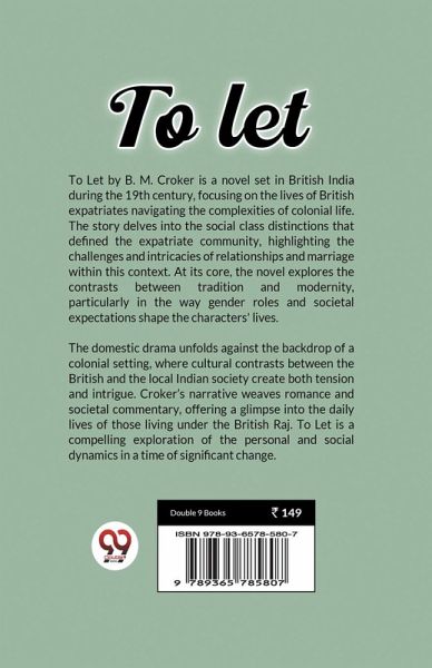 To Let by B. M. Croker is a novel set in British India during the 19th century, focusing on the lives of British expatriates navigating the complexities of colonial life. The story delves into the social class distinctions that defined the expatriate community, highlighting the challenges and intricacies of relationships and marriage within this context. At its core, the novel explores the contrasts between tradition and modernity, particularly in the way gender roles and societal expectations shape the characters' lives. The domestic drama unfolds against the backdrop of a colonial setting, where cultural contrasts between the British and the local Indian society create both tension and intrigue. Croker's narrative weaves romance and societal commentary, offering a glimpse into the daily lives of those living under the British Raj. To Let is a compelling exploration of the personal and social dynamics in a time of significant change.