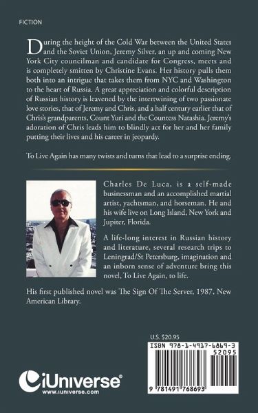 During the height of the Cold War between the United States and the Soviet Union, Jeremy Silver, an up and coming New York City councilman and candidate for Congress, meets and is completely smitten by Christine Evans. Her history pulls them both into an intrigue that takes them from NYC and Washington to the heart of Russia. A great appreciation and colorful description of Russian history is leavened by the intertwining of two passionate love stories, that of Jeremy and Chris, and a half century earlier that of Chris's grandparents, Count Yuri and the Countess Natashia. Jeremy's adoration of Chris leads him to blindly act for her and her family putting their lives and his career in jeopardy. To Live Again has many twists and turns that lead to a surprise ending.