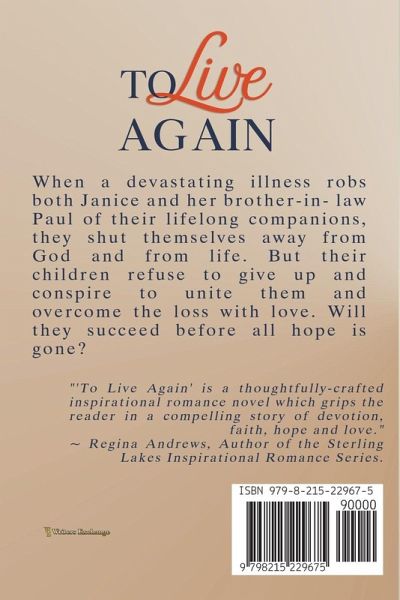 When a devastating illness robs both Janice and her brother-in-law Paul of their lifelong companions, they shut themselves away from God and from life. But their children refuse to give up and conspire to unite them and overcome the loss with love. Will they succeed before all hope is gone? "'To Live Again' is a thoughtfully-crafted inspirational romance novel which grips the reader in a compelling story of devotion, faith, hope and love." ~ Regina Andrews, Author of the Sterling Lakes Inspirational Romance Series.