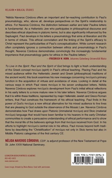 To Live in the Spirit: Paul and the Spirit of God brings to light a fresh understanding of the Greek concept πνε¿μα (spirit) in Paul’s ethical teaching. Placing Paul and his mixed audience within the Hellenistic Jewish and Greek (philosophical) traditions of the ancient world, this book examines his new message concerning πνε¿μα’s primary function in the acquisition of virtues and avoidance of vices. Looking in detail at the various ways in which Paul views πνε¿μα in his seven undisputed letters, Naveros Córdova explores πνε¿μα’s development from Paul’s initial ethical reflections in his early letters to a more mature view in his later letters. Naveros Córdova argues that it is within these traditions, represented by major Hellenistic Jewish and Greco-Roman writers, that Paul construes the framework of his ethical teaching. Paul finds in the power of God’s πνε¿μα a new ethical alternative for his mixed audience to living lives pleasing to God outside the observance of the Mosaic Law. Naveros Córdova demonstrates how Paul draws upon Platonic (immaterial πνε¿μα) and Stoic (material πνε¿μα) language that would have been familiar to his hearers in the early Christian communities to create a persuasive understanding of ethical performance and to show that the moral life of the believers springs from that πνε¿μα received from God. In his efforts to highlight πνε¿μα’s central role in his ethics, Paul moves beyond both traditions by describing the "Christification" of πνε¿μα not only in Stoic terms, but also in Middle Platonic categories of the first century CE.