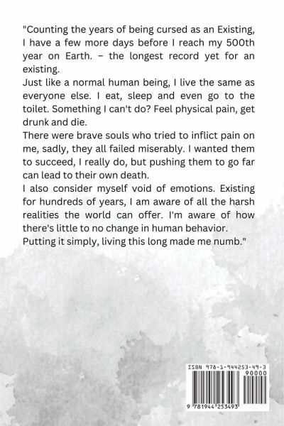 Counting the years of being cursed as an Existing, I have a few more days before I reach my 500th year on Earth. - the longest record yet for an existing. Just like a normal human being, I live the same as everyone else. I eat, sleep and even go to the toilet. Something I can't do? Feel physical pain, get drunk and die. There were brave souls who tried to inflict pain on me, sadly, they all failed miserably. I wanted them to succeed, I really do, but pushing them to go far can lead to their own death. I also consider myself void of emotions. Existing for hundreds of years, I am aware of all the harsh realities the world can offer. I'm aware of how there's little to no change in human behavior. Putting it simply, living this long made me numb.