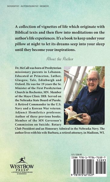 Dr. McCall was born of Presbyterian missionary parents in Lebanon. Educated at Princeton, Luther, Glasgow, Yale, Edinburgh and Oxford. He was for 19 years the Sr. Minister of the First Presbyterian Church in Rochester, MN. Member of the Mayo Clinic IRB. Served on the Nebraska State Board of Parole. A Retired Commander in the U.S. Navy and a Korean War veteran. Adjunct Homiletics professor. Author of three previous books. Member of the MN Governor's Commission on Suicide. Rotary Club President and an Honorary Admiral in the Nebraska Navy. The author lives with his wife Barbara, a retired attorney, in Madison, WI.