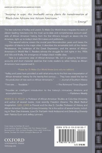 The two volumes of Kelley and Lewis's To Make Our World Anew integrate the work of eleven leading historians into the most up-to-date and comprehensive account available of African American history, from the first Africans brought as slaves into the Americas, right up to today's black filmmakers and politicians. This second volume covers the crucial post-Reconstruction years and traces the migration of blacks to the major cities. It describes the remarkable birth of the Harlem Renaissance, the hardships of the Great Depression, and the service of African Americans in World War II. Readers witness the struggle for Civil Rights in the 1950s and '60s and finally, the emergence of today's black middle class. Here is a panoramic view of African-American life, rich in gripping first-person accounts and short character sketches that invite readers to relive history as African Americans have experienced it.