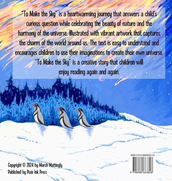 Embark on a magical journey to the icy realms where glaciers swirl, and a new, young voice echoes through the frigid air. In this enchanting tale, a small and curious voice breaks the silence of the perpetual day, asking the timeless question, "Mama, why is the sky blue?" Join a wise mother penguin as she unfolds the epic tale of the universe's creation. From the birth of oceans bursting through the earth to the celebration of mountains, jungles, deserts, and grassy plains, the story weaves through the formation of the world. Even the moon and sun find their place in this cosmic dance. As the celestial duo contemplates which colors to paint the infant sky, flora, fauna, land, and air each offer their unique hues. A captivating moment arises when ten thousand butterflies flutter their wings, and millions of cerulean specks fling their brilliance into the canvas of the sky. Discover the secret behind the sun choosing the radiant bright blue of daylight and the moon embracing the deep navy of night. This age-old lore reveals how the universe, with the collaborative efforts of creatures from low and high, came together to create the wondrous sky. "To Make the Sky" is a heartwarming journey that answers a child's curious question while celebrating the beauty of nature and the harmony of the universe. Illustrated with vibrant artwork by March Mattingly that captures the beauty of the world around us. The text is easy to understand and encourages children to use their imaginations to create their own universe. "To Make the Sky" is a creative story that children will enjoy reading again and again. "To Make the Sky" is a perfect bedtime story for curious children of all ages.