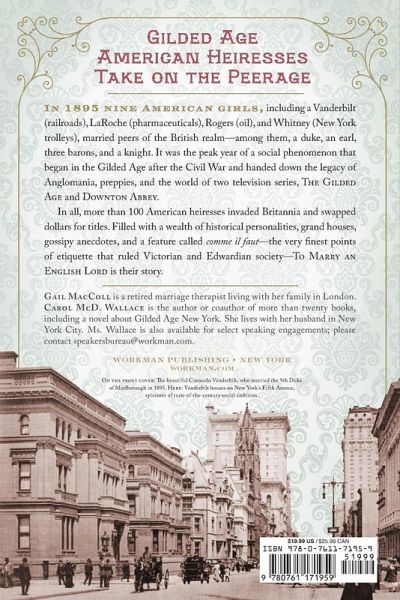 Gilded Age American Heiresses Take on the Peerage In 1895 nine American girls, including a Vanderbilt (railroads), LaRoche (pharmaceuticals), Rogers (oil), and Whitney (New York trolleys), married peers of the British realm—among them, a duke, an earl, three barons, and a knight. It was the peak year of a social phenomenon that began in the Gilded Age after the Civil War, and handed down the legacy of Anglomania, preppies, and the world of two television series, Downton Abbey and The Gilded Age. In all, more than 100 American heiresses invaded Britannia and swapped dollars for titles. Filled with a wealth of historical personalities, grand houses, gossipy anecdotes, and a feature called comme il faut—the very finest points of etiquette that ruled Victorian and Edwardian society—To Marry an English Lord is their story.