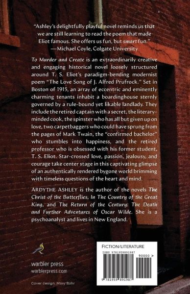 To Murder and Create is an extraordinarily creative and engaging historical novel loosely structured around T. S. Eliot's paradigm-bending modernist poem "The Love Song of J. Alfred Prufrock." Set in Boston of 1915, an array of eccentric and eminently charming tenants inhabit a boardinghouse sternly governed by a rule-bound yet likable landlady. They include the retired captain with a secret, the literary-minded cook, the spinster who has all but given up on love, two carpetbaggers who could have sprung from the pages of Mark Twain, the "confirmed bachelor" who stumbles into happiness, and the retired professor who is obsessed with his former student, T. S. Eliot. Star-crossed love, passion, jealousy, and courage take center stage in this captivating glimpse of an authentically rendered bygone world brimming with timeless questions of the heart and mind.