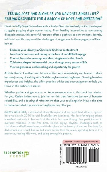 Feeling lost and alone as you navigate single life? Feeling desperate for a beacon of hope and direction? Dive into To My Single Sister where author Kaelyn Gauthier fearlessly tackles the deepest struggles plaguing single women today. From battling insecurities to overcoming disappointments, this powerful resource offers a pathway to contentment, identity in Christ, and thriving amid the challenges of singleness. In these pages, you'll learn how to: Embrace your identity in Christ and find true contentment Trust God's provision and timing in the face of unfulfilled longings Combat lies and misconceptions about singleness in the church Cultivate a deeper intimacy with Jesus through every season of life View singleness as a noble calling and opportunity for growth Athlete Kaelyn Gauthier uses letters written with vulnerability and humor to share her own journey of walking with God through extended singleness. Drawing from her experiences and insights, she offers practical advice and encouragement to help you thrive in this distinctive season. Whether you're a single woman or know someone who is, this book has wisdom for you. Kaelyn invites you to join her on this transformative journey of honesty, relatability, and a dousing of refreshment that your soul longs for. Now is the time to rediscover what this season of singleness can offer you.