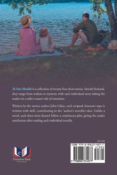 To Our Health! is a collection of twenty-four short stories. Strictly fictional, they range from realism to mystery, with each individual story taking the reader on a roller-coaster ride of emotions. Written by the novice author John Gikas, each scripted character type is written with skill, contributing to the 'author's novella's idea. Unlike a novel, each short story doesn't follow a continuous plot, giving the reader satisfaction after reading each individual novella.