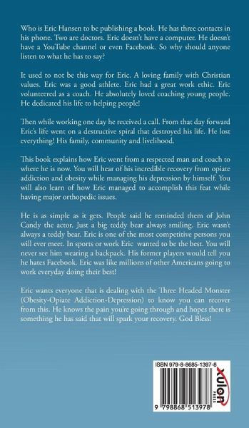 Who is Eric Hansen to be publishing a book. He has three contacts in his phone. Two are doctors. Eric doesn't have a computer. He doesn't have a YouTube channel or even Facebook. So why should anyone listen to what he has to say? It used to not be this way for Eric. A loving family with Christian values. Eric was a good athlete. Eric had a great work ethic. Eric volunteered as a coach. He absolutely loved coaching young people. He dedicated his life to helping people! Then while working one day he received a call. From that day forward Eric's life went on a destructive spiral that destroyed his life. He lost everything! His family, community and livelihood. This book explains how Eric went from a respected man and coach to where he is now. You will hear of his incredible recovery from opiate addiction and obesity while managing his depression by himself. You will also learn of how Eric managed to accomplish this feat while having major orthopedic issues. He is as simple as it gets. People said he reminded them of John Candy the actor. Just a big teddy bear always smiling. Eric wasn't always a teddy bear. Eric is one of the most competitive persons you will ever meet. In sports or work Eric wanted to be the best. You will never see him wearing a backpack. His former players would tell you he hates Facebook. Eric was like millions of other Americans going to work everyday doing their best! Eric wants everyone that is dealing with the Three Headed Monster (Obesity-Opiate Addiction-Depression) to know you can recover from this. He knows the pain you're going through and hopes there is something he has said that will spark your recovery. God Bless!