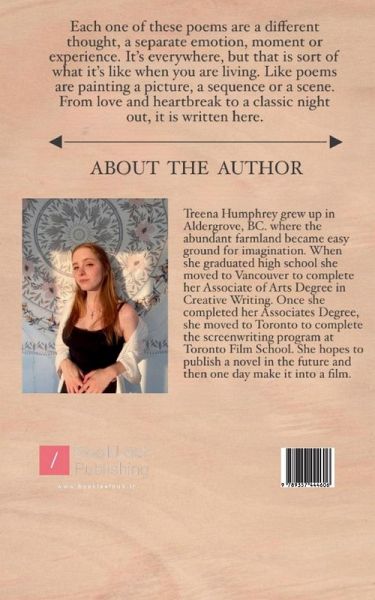 Each of these poems are a different thought, a separate emotion, moment or experience. It's everywhere but that is sort of what it's like when you are living. Like poem is painting a picture, a sequence or a scene. From love to heartbreak to a classic night out, it is written here.