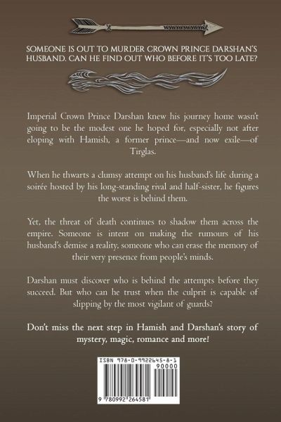 Someone is out to murder his husband and he might just be the reason they succeed. Imperial Crown Prince Darshan knew his journey home wasn't going to be the modest one he hoped for, especially not after eloping with Hamish, a former prince-and now exile-of Tirglas. When he thwarts a clumsy attempt on his husband's life during a soirée hosted by his long-standing rival and half-sister, he figures the worst is behind them. Yet, the threat of death continues to shadow them across the empire. Someone is intent on making the rumours of his husband's demise a reality, someone who can erase the memory of their very presence from people's minds. Darshan must discover who is behind the attempts before they succeed. But who can he trust when the culprit is capable of slipping by the most vigilant of guards? Don't miss the next step in Hamish and Darshan's story of mystery, magic, romance and more!