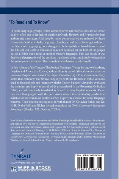 In some language groups, Bible commentaries and translations are of lesser quality, often due to the lack of training in Greek, Hebrew, and Aramaic for their authors and translators. Additionally, many commentaries are authored by those who are unfamiliar with the language, church, and culture of the target audience. Further, some language groups struggle with the quality of translations even of the biblical text itself. A translation may not be based on the biblical languages but on a Bible translation in another modern language. This can result in the theological perspective of the previous translators being unwittingly written into the subsequent translation. How can these challenges be addressed? In this volume of the Tyndale Theological Seminary Theses Series, two brothers, Bogdan and Alexandru Costea, address these types of biblical studies issues in Romania. Bogdan writes about the importance of having a Romanian commentary series that compares the biblical languages with the Romanian Bible versions used by Evangelicals and interacts with the Church Fathers. Alexandru evaluates the meaning and implications of ¿¿¿¿ as translated in the Romanian Orthodox Bible, a word commonly translated as ""save"" in many English contexts. These two men thus grapple with the core issues related to commentary production suitable for the Romanian context as well as provide a model for other language contexts. Their interest, in conjunction with that of Dr. Octavian Baban and Dr. H. H. Drake Williams III, has helped to produce the Seria Comentarii Exegetice Romane¿ti (Oradea, RO: Decenu, 2023-).