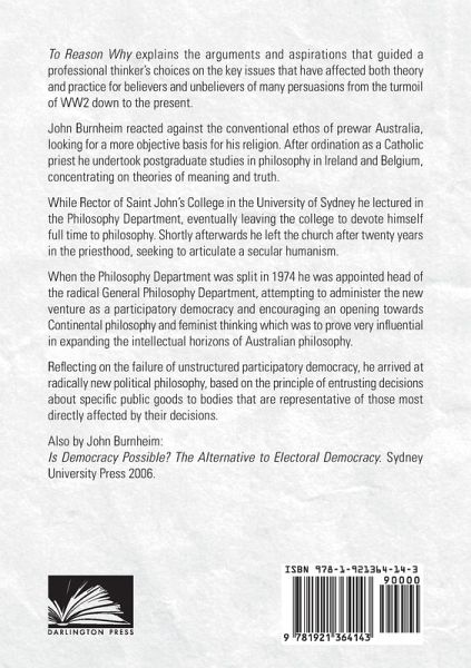 To reason why explains the arguments and aspirations that guided a professional thinker's choices on the key issues that have affected both theory and practice for believers and unbelievers of many persuasions from the turmoil of World War Two down to the present. John Burnheim reacted against the conventional ethos of prewar Australia, looking for a more objective basis for his religion. After ordination as a Catholic priest he undertook postgraduate studies in philosophy in Ireland and Belgium, concentrating on theories of meaning and truth. While Rector of Saint John's College in the University of Sydney he lectured in the Philosophy Department, eventually leaving the college to devote himself full time to philosophy. Shortly afterwards he left the church after twenty years in the priesthood, seeking to articulate a secular humanism. When the Philosophy Department was split in 1974 he was appointed head of the radical General Philosophy Department, attempting to administer the new venture as a participatory democracy and encouraging an opening towards Continental philosophy and feminist thinking which was to prove very influential in expanding the intellectual horizons of Australian philosophy. Reflecting on the failure of unstructured participatory democracy, he arrived at radically new political philosophy, based on the principle of entrusting decisions about specific public goods to bodies that are representative of those most directly affected by their decisions.