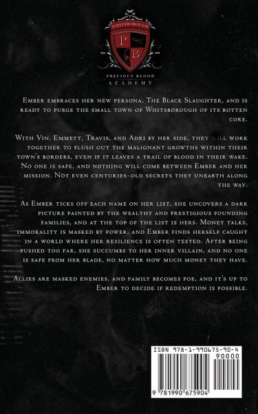 Ember embraces her new persona, The Black Slaughter, and is ready to purge the small town of Whitsborough of its rotten core. With Vin, Emmett, Travis, and Adri by her side, they will work together to flush out the malignant growths within their town's borders, even if it leaves a trail of blood in their wake. No one is safe, and nothing will come between Ember and her mission. Not even centuries-old secrets they unearth along the way. As Ember ticks off each name on her list, she uncovers a dark picture painted by the wealthy and prestigious founding families, and at the top of the list is hers. Money talks, immorality is masked by power, and Ember finds herself caught in a world where her resilience is often tested. After being pushed too far, she succumbs to her inner villain, and no one is safe from her blade, no matter how much money they have. Allies are masked enemies, and family becomes foe, and it's up to Ember to decide if redemption is possible.
