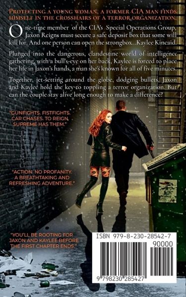Perfect for thriller fans who enjoy a good and decent main character - noble friends - action - clean language - no graphic sex - a little romance - and an undertone of faith from a Christian worldview. Protecting a young woman, a former CIA man finds himself in the crosshairs of a terror organization. One-time member of the CIA's Special Operations Group, Jaxon Reigns must secure a safe deposit box that some will kill for. And one person can open the strongbox...Kaylee Kincaid. Plunged into the dangerous, clandestine world of intelligence gathering, with a bull's-eye on her back, Kaylee is forced to place her life in Jaxon's hands, a man she's known for all of five minutes. Together, jet-setting around the globe, dodging bullets, Jaxon and Kaylee hold the key to toppling a terror organization. But can the couple stay alive long enough to make a difference? Pulse-pounding, clean language thriller featuring a burned CIA special operator who now serves the American people by going where others won't and doing what others can't. - Book #1 in the Jaxon Reigns series of Ex-Military Thrillers -