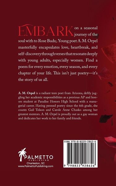 to Rose Buds; is an evocative poetry collection that takes you on a profound journey through the four seasons of love, heartbreak, and self-discovery. Crafted to captivate the hearts of young adults-particularly women-this remarkable anthology offers more than just words on a page; it serves as a soulful guide through life's highs and lows. Beginning with the fresh hopefulness of spring and traveling through the heat of summer romances, the collection later dives into autumn's heart-wrenching goodbyes and finally settles into winter's introspective solitude. Each section is a milestone, each poem a snapshot capturing the raw emotions that come with the changing tides of life and love. This is more than a book; it's a shared experience. Penned by A. M. Orpel, a talented young poet from Arizona, these verses vibrate with the joys, sorrows, and complexities of life as a young, gay woman. The pages overflow with words that resonate, challenge, and comfort. Here you will find poems that echo your secret thoughts, validate your hidden feelings, and provide solace for your unspoken pains. So, if you're navigating the complexities of life, love, and everything in between, let to Rose Buds; be your compass, your consolation, and your celebration of a journey we all share. Turn the page, and step into a world that knows you, inside and out.