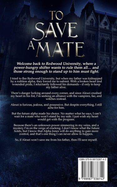 Welcome back to Redwood University, where a power-hungry shifter wants to rule them all; and those strong enough to stand up to him must fight. I tried to flee Redwood University, but when my father was kidnapped by a ruthless alpha, I was forced to submit. With a broken heart and wounded pride, I reluctantly followed his demands-if only to keep my father alive. There's danger lurking around every corner, and since Alexei crushed my heart in his fist, I sought an alliance with the vampires, fae, and witches instead. Alexei is furious, jealous, and possessive. But despite everything, I still ache for him. But the future alpha made his choice. No matter what he says, I can't wait for a mate that won't stand by my side. I just wish my heart would get with the program. Because there's an unknown power simmering in my veins, and a mystery I'm on the verge of cracking. I don't know what the future holds, but I do know that Alpha Jones will do anything to gain more control, and that's one thing I can never allow to happen. So, if Alexei won't save me from his father, then I'lll save myself. *To Save a Mate is the second book in the Redwood University Trilogy. It cannot be read as a standalone and ends in a cliffhanger. If possessive heroes, who occasionally turn into wolves, and sassy, headstrong heroines are your jam, you've come to the right place. So sit back, relax, and enjoy the continuation of this exciting paranormal story.