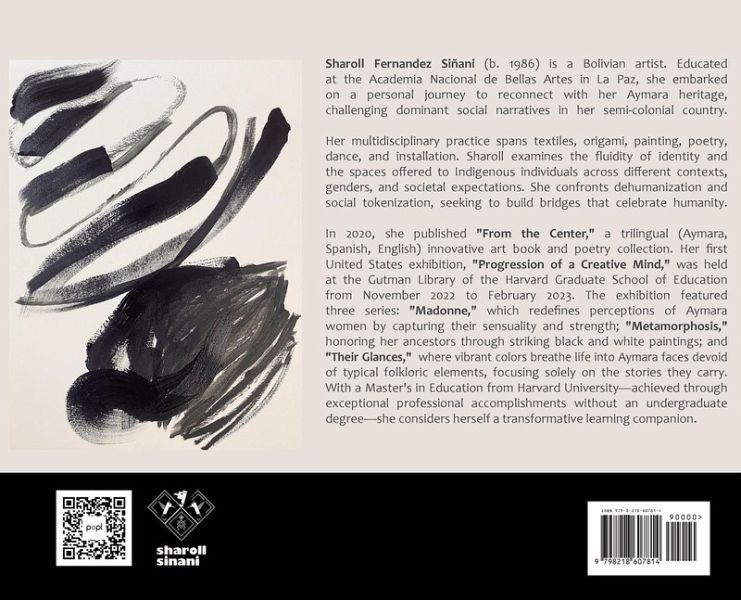 Sharoll Fernandez Siñani (b. 1986) is a Bolivian artist whose work explores the universality of beauty as essential to human self-realization. Educated at the Academia Nacional de Bellas Artes in La Paz, she embarked on a personal journey to reconnect with her Aymara heritage, challenging dominant social narratives in her semi-colonial country.Her multidisciplinary practice spans textiles, origami, painting, poetry, dance, and installation. Sharoll examines the fluidity of identity and the spaces offered to Indigenous individuals across different contexts, genders, and societal expectations. She confronts dehumanization and social tokenization, seeking to build bridges that celebrate humanity.In 2020, she published "From the Center," a trilingual (Aymara, Spanish, English) innovative art book and poetry collection. Her first U.S. exhibition, "Progression of a Creative Mind," was held at the Gutman Library of the Harvard Graduate School of Education from November 2022 to February 2023. The exhibition featured three series: "Madonne," which redefines perceptions of Aymara women by capturing their sensuality and strength; "Metamorphosis," honoring her ancestors through striking black and white paintings; and "Their Glances," where vibrant colors breathe life into Aymara faces devoid of typical folkloric elements, focusing solely on the stories they carry.Founder and CEO of the Zera Bolivia Foundation, Sharoll is committed to the pedagogy of art and the art of pedagogy to bring out from each person what truly resides, valuable as a treasure, within them. With a Master's in Education from Harvard University-achieved through exceptional professional accomplishments without an undergraduate degree-she considers herself a transformative learning companion.At the core of Sharoll's work is a profound inquiry into beauty and pleasure, aiming to advance their understanding as fundamental aspects of human realization.