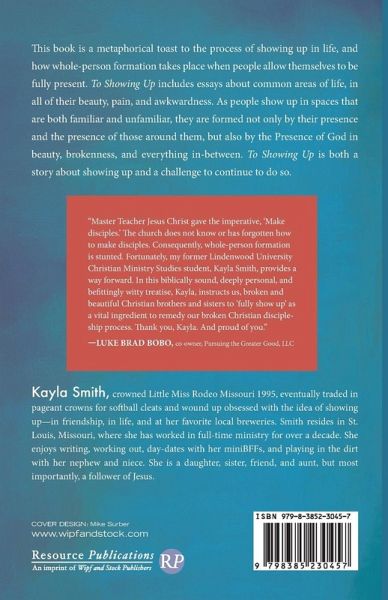This book is a metaphorical toast to the process of showing up in life and how whole-person formation takes place when people allow themselves to be fully present. To Showing Up includes essays about common areas of life in all of their beauty, pain, and awkwardness. As people show up in spaces that are both familiar and unfamiliar, they are formed not only by their presence and the presence of those around them but also by the Presence of God in beauty, brokenness, and everything in-between. To Showing Up is both a story about showing up and a challenge to continue to do so.