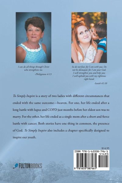 To Simply Inspire is a story of two ladies with different circumstances that ended with the same outcome-heaven. For one, her life ended after a long battle with lupus and COPD just months before her eldest son was to marry. For the other, her life ended as a single mom after a short and fierce battle with cancer. Both stories have one thing in common, the presence of God. To Simply Inspire also includes a chapter specifically designed to inspire our youth.