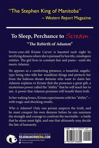 "The Stephen King of Manitoba" - Western Report Magazine Seven-year-old Krissie Carver is haunted each night by terrifying dreams where she is pursued by horrific, misshapen entities. The girl lives in constant fear and panic-until she meets Adamm. He appears as a comforting presence, a beautiful, angelic-type being who tells her wondrous things and protects her from the hideous dream demons who want to claim her. Adamm explains to Krissie that she possesses a great gift, a mysterious power called the "ability" that he will teach her to use. A power that Adamm promises will benefit them both. In her waking hours, Krissie experiments with her "ability"-with tragic and shocking results. Who is Adamm? Only one person suspects the truth, and he must conquer his own demons before he can summon the strength and courage to confront the inevitable-a battle that he alone must fight, and one that ultimately may decide the fate of humanity.