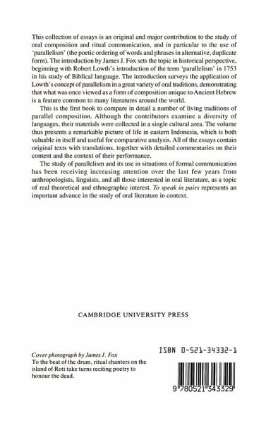 This collection of essays is an original and major contribution to the study of oral composition and ritual communication, and in particular to the use of 'parallelism' (the poetic ordering of words and phrases in alternative, duplicate form). The introduction by James J. Fox sets the topic in historical perspective, beginning with Robert Lowth's introduction of the term 'parallelism' in 1753 in his study of Biblical language. The introduction surveys the application of Lowth's concept of parallelism in a great variety of oral traditions, demonstrating that what was once viewed as a form of composition unique to Ancient Hebrew is a feature common to many literatures around the world. This is the first book to compare in detail a number of living traditions of parallel composition. The volume thus presents a remarkable picture of life in eastern Indonesia, which is both valuable in itself and useful for comparative analysis. All of the essays contain original texts with translations, together with detailed commentaries on their content and the context of their performance. The study of parallelism and its use in situations of formal communication has been receiving increasing attention over the last few years from anthropologists, linguists, and all those interested in oral literature, as a topic of real theoretical and ethnographic interest. To Speak in Pairs represents an important advance in the study of oral literature in context.