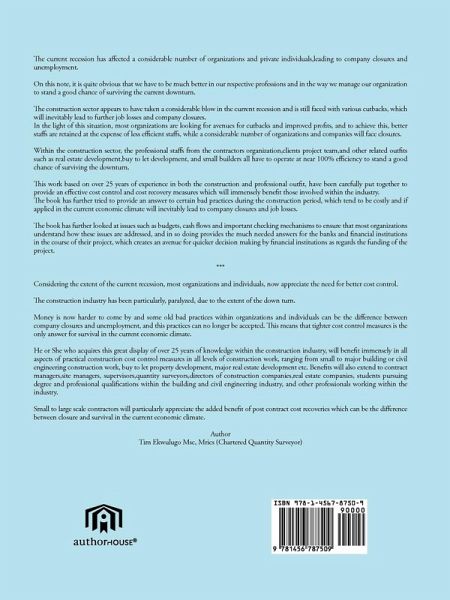 The current recession has affected a considerable number of organizations and private individuals,leading to company closures and unemployment. On this note, it is quite obvious that we have to be much better in our respective professions and in the way we manage our organization to stand a good chance of surviving the current downturn. The construction sector appears to have taken a considerable blow in the current recession and is still faced with various cutbacks, which will inevitably lead to further job losses and company closures. In the light of this situation, most organizations are looking for avenues for cutbacks and improved profits, and to achieve this, better staffs are retained at the expense of less efficient staffs, while a considerable number of organizations and companies will face closures. Within the construction sector, the professional staffs from the contractors organization,clients project team,and other related outfits such as real estate development,buy to let development, and small builders all have to operate at near 100% efficiency to stand a good chance of surviving the downturn. This work based on over 25 years of experience in both the construction and professional outfit, have been carefully put together to provide an effective cost control and cost recovery measures which will immensely benefit those involved within the industry. The book has further tried to provide an answer to certain bad practices during the construction period, which tend to be costly and if applied in the current economic climate will inevitably lead to company closures and job losses. The book has further looked at issues such as budgets, cash flows and important checking mechanisms to ensure that most organizations understand how these issues are addressed, and in so doing provides the much needed answers for the banks and financial institutions in the course of their project, which creates an avenue for quicker decision making by financial institutions as regards the funding of the project.