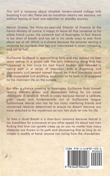 This isn't a romance about chiseled, lantern-jawed college kids boasting V-cut abs. There are no marathon steamy sex sessions, not without having at least one nebulizer on standby anyway. Marcel Giresse, the thirty-six-year-old Director of Finance at the French Ministry of Justice, is happy to leave all that nonsense to his oldest friend Lucien, the sixteenth Earl of Rossingley. In fact, Marcel is too short of breath and too set in his nerdy ways to ever think about sex at all. Which is a shame because the prisoner serving a sentence for murderer that he's just interviewed is smart, intriguing, and hot as hell. Guillaume Guilbaud is approaching forty and has wasted his best years rotting in a prison cell. The only interesting thing that has happened to him since his best friend Reuben was released is taking part in a series of interviews with a disarming and charismatic civil servant named Marcel. As if that friendship could ever materialize into anything, especially as he feels so ill-prepared for his imminent life on the outside. But after a chance meeting at Rossingley, Guillaume finds himself renting Marcel's annex and desperately falling for his sweet, chronically ill landlord. Which is crazy, because Marcel is celibate, posh, clever, and fundamentally out of Guillaume's league. Furthermore, Marcel also has far too many interfering friends and concerned relatives determined to ensure he doesn't become any more attached to the mysterious ex-con he's shyly let into his life. To Take a Quiet Breath is a slow-burn romance because Marcel is too breathless for a romance at any other speed. It's about two men finding that love can quietly creep up on you no matter how many obstacles are thrown in its path and discovering that as long as an inhaler is readily at hand, anyone can swing from the chandeliers.
