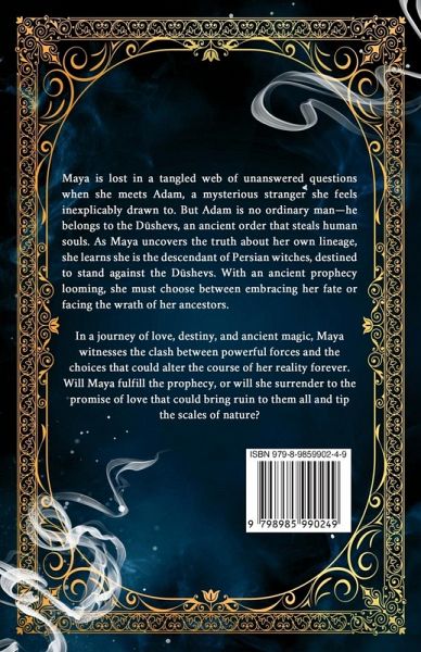 Maya is lost in a tangled web of unanswered questions when she meets Adam, a mysterious stranger she feels inexplicably drawn to. But Adam is no ordinary man-he belongs to the D¿shevs, an ancient order that steals human souls. As Maya uncovers the truth about her own lineage, she learns she is the descendant of Persian witches, destined to stand against the D¿shevs. With an ancient prophecy looming, she must choose between embracing her fate or facing the wrath of her ancestors. In a journey of love, destiny, and ancient magic, Maya witnesses the clash between powerful forces and the choices that could alter the course of her reality forever. Will Maya fulfill the prophecy, or will she surrender to the promise of love that could bring ruin to them all and tip the scales of nature?