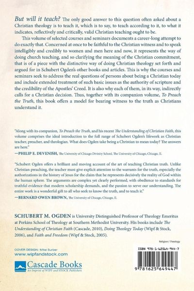 But will it teach? The only good answer to this question often asked about a Christian theology is to teach it, which is to say, to teach according to it, to what it indicates, reflectively and critically, valid Christian teaching ought to be. This volume of selected courses and seminars documents a career-long attempt to do exactly that. Concerned at once to be faithful to the Christian witness and to speak intelligibly and credibly to women and men here and now, it represents the way of doing church teaching, and so clarifying the meaning of the Christian commitment, that is of a piece with the distinctive way of doing Christian theology set forth and argued for in Schubert Ogden's other books and articles. This is why the courses and seminars seek to address the real questions of persons about being a Christian today and include extended treatment of such basic issues as the authority of Scripture and the credibility of the Apostles' Creed. It is also why each of them, in its way, indirectly calls for a Christian decision. Thus, together with its companion volume, To Preach the Truth, this book offers a model for bearing witness to the truth as Christians understand it.