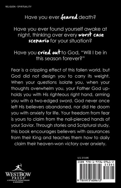 Have you ever feared death? Have you ever found yourself awake at night, thinking over every worst-case scenario for your situation? Have you cried out to God, Will I be in this season forever? Fear is a crippling effect of this fallen world, but God did not design you to carry its weight. When your questions isolate you, when your thoughts overwhelm you, your Father God upholds you with his righteous right hand, arming you with a two-edged sword. God never once left his believers abandoned, nor did he doom you with anxiety for life. Your freedom from fear is yours to claim from the nail-pierced hands of your Savior. Through stories and scriptural study, this book encourages believers with assurances from their King and teaches them how to daily claim their heaven-won victory over anxiety.