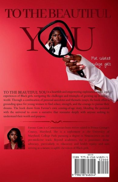 To the Beautiful You is a heartfelt and empowering exploration of the lived experiences of Black girls, navigating the challenges and triumphs of growing up in today's world. With lyrical prose and profound emotional depth, this debut memoir and collection of thematic essays unravels the beauty and pain of becoming-of moving through childhood into womanhood, from invisibility to self-acceptance, and from silence to empowered voice. The book draws from Favour's own coming-of-age story, blending the personal with the universal to create a narrative that resonates deeply with anyone seeking to understand their worth and purpose.Each chapter peels back the layers of a young woman learning to make peace with her sensitivity, to hold her dreams sacred, and to see her reflection not as something to be altered, but celebrated. With deep empathy and a sharp eye for the unspoken, Favour reflects on what it means to be a first-generation African American student chasing excellence in spaces not always designed for her success. She speaks to the pressures of perfectionism, the power of mentorship, the complicated beauty of home, and the radical act of self-love in a world that often asks Black girls to shrink.To the Beautiful You is more than a memoir; it is a grounding space, a love letter, and a mirror. It is for the girl who never felt seen, for the young woman searching for her place in the world, and for anyone who believes that the journey to self is one worth taking-again and again.