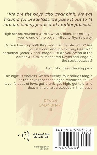 "We are the boys who wear pink. We eat trauma for breakfast, we puke it out to fit into our skinny jeans and leather jackets." High school reunions were always a bitch. Especially if you're one of the boys invited to Ryan's party. Do you live it up with King and the Trouble Twins? Are you still cool enough to chug beer with basketball jocks Si and Badger? Or do you cower in the corner with mild-mannered Reyes and Angelo, the social outcast? Also, who hired the stripper? The night is endless. Watch twenty-four stories tangle as the boys reconnect, fight, reminisce, fall in love, fall out of love, get drunk, get high, get laid, and deal with a shared tragedy in their past.