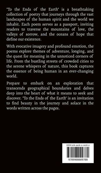 "To the Ends of the Earth" is a breathtaking collection of poetry that journeys through the vast landscapes of the human spirit and the world we inhabit. Each poem serves as a passport, inviting readers to traverse the mountains of love, the valleys of sorrow, and the oceans of hope that define our existence. With evocative imagery and profound emotion, the poems explore themes of adventure, longing, and the quest for meaning in the unnoticed corners of life. From the bustling streets of crowded cities to the serene whispers of nature, this book captures the essence of being human in an ever-changing world. Prepare to embark on an exploration that transcends geographical boundaries and delves deep into the heart of what it means to seek and discover. "To the Ends of the Earth" is an invitation to find beauty in the journey and solace in the words written across the pages.