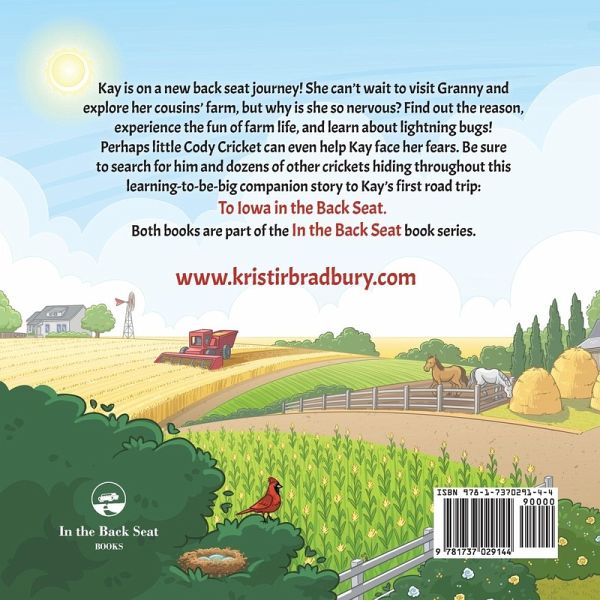 Kay is on a new back seat journey! She can't wait to visit Granny and explore her cousins' farm, but why is she so nervous? Find out the reason, experience the fun of farm life, and learn about lightning bugs! Perhaps little Cody Cricket can even help Kay face her fears. Be sure to search for him and dozens of other crickets hiding throughout this learning-to-be-big companion story to Kay's first road trip: To Iowa in the Back Seat. Both books are part of the In the Back Seat book series.