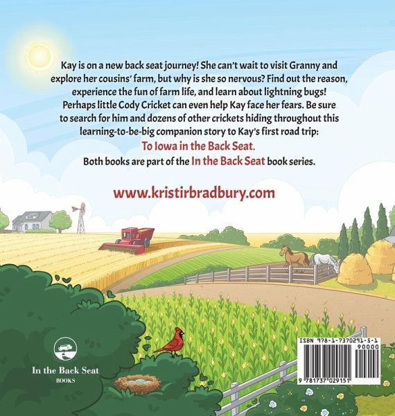 Kay is on a new back seat journey! She can't wait to visit Granny and explore her cousins' farm, but why is she so nervous? Find out the reason, experience the fun of farm life, and learn about lightning bugs! Perhaps little Cody Cricket can even help Kay face her fears. Be sure to search for him and dozens of other crickets hiding throughout this learning-to-be-big companion story to Kay's first road trip: To Iowa in the Back Seat. Both books are part of the In the Back Seat book series.