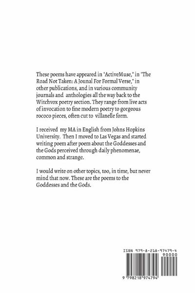 These poems have been published in "Active Muse," "The Road Not Taken: A Journal For Formal Verse," in other publications, and in various community journals and anthologies all the way back to the Witchvox poetry section. They range from acts of invocation to fine modern poetry to lovely rococo pieces, many in villanelle form. All concern the Goddesses and the Gods. You may never unsee Them again. I received my MA in English from Johns Hopkins University, then took an uncertain career decision by moving to Las Vegas. While here, I've written these poems. Lately, I've written on other subjects as well, but never mind these. These are about the Goddesses and the Gods.