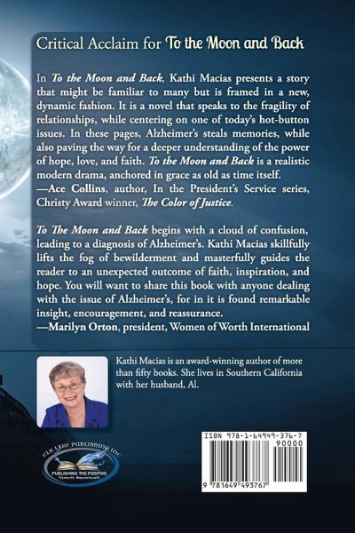 In To the Moon and Back, Kathi Macias presents a story that might be familiar to many but is framed in a new, dynamic fashion. It is a novel that speaks to the fragility of relationships, while centering on one of today's hot-button issues. In these pages, Alzheimer's steals memories, while also paving the way for a deeper understanding of the power of hope, love, and faith. To the Moon and Back is a realistic modern drama, anchored in grace as old as time itself. -Ace Collins, author, In the President's Service series, Christy Award winner, The Color of Justice. To The Moon and Back begins with a cloud of confusion, leading to a diagnosis of Alzheimer's. Kathi Macias skillfully lifts the fog of bewilderment and masterfully guides the reader to an unexpected outcome of faith, inspiration, and hope. You will want to share this book with anyone dealing with the issue of Alzheimer's, for in it is found remarkable insight, encouragement, and reassurance. -Marilyn Orton, president, Women of Worth International