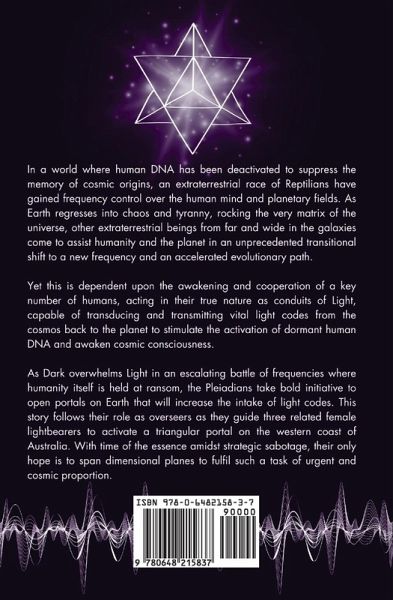 In a world where human DNA has been deactivated to suppress the memory of cosmic origins, an extraterrestrial race of Reptilians have gained frequency control over the human mind and planetary fields. As Earth regresses into chaos and tyranny, rocking the very matrix of the universe, other extraterrestrial beings from far and wide in the galaxy come to assist humanity and the planet in an unprecedented transitional shift to a new frequency and an accelerated evolutionary path. They can only do this however, with the awakening and cooperation of a certain key number of humans, acting in their true nature as conduits of Light capable of transducing and transmitting vital light codes from the cosmos back to the planet, and stimulating the activation of dormant human DNA and human consciousness. As Dark overwhelms Light in an escalating battle of frequencies where humanity itself is held ransom, the Pleiadians take bold initiative to open portals on Earth that will increase the intake of Light codes. This intergalactic thriller follows their role as overseer as they guide three human lightbearers related in a mother-daughter trilogy to activate a triangulated portal on the western coast of Australia. With time of the essence, their only hope is to span dimensional planes to fulfil such a task of cosmic proportion.