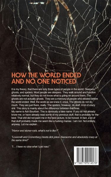 How the world ended and no one noticed...It is my theory, that there are only three types of people in the world: Sleepers, ghosts, and spiders. Most people are sleepers. They walk around and function relatively normal, but they do not know what is going on around them.The ghosts are not actually ghosts. They are a memory of people who existed before the world ended. Well, the world as we knew it, once. The ghosts do not do much. They are just there, really. The spiders, however, do stuff. A lot of crazy shit. This story is mainly about the difference between the three.My name is Ash Bourbon. This is obviously a fake name. If you do not already know me, or have already read some of my previous stuff, that is probably for the best. That shit did not paint me in the best picture, to be honest. In fact, a lot of that stuff probably made me seem like a fucking maniac. I am not. Not entirely, anyway. Let me explain...