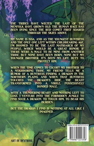 The tribes have wilted. The last of the menfolk have grown old. The human race has been dying since the red comet first soared through the skies above. My name is Issa, and as the youngest huntress and the only one left within childbearing age, I'm doomed to be the last matriarch of my people. Which would be a great honor, if there were a male to be mine from another tribe. But none have been born, none but my younger brother. It's been my life duty to protect him. When the time comes to escort my brother to a neighboring tribe, my friend tells me a rumor of a huntress finding a dragon in the northern plains. And when that huntress touched the dragon's hide, the beast transformed into a virile, possessively bonded male. With a thundering heart and nothing left to lose, I venture into the Forbidden Jungle to find such a dragon. To touch him, to bear his burden. But the dragon I find is nothing at all as I imagined...