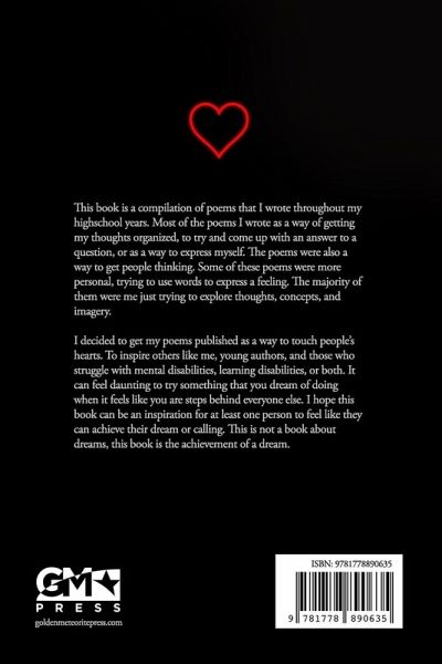 This book is a compilation of poems that I wrote throughout my highschool years. Most of the poems I wrote as a way of getting my thoughts organized, to try and come up with an answer to a question, or as a way to express myself. The poems were also a way to get people thinking. Some of these poems were more personal, trying to use words to express a feeling. The majority of them were me just trying to explore thoughts, concepts, and imagery. I decided to get my poems published as a way to touch people's hearts. To inspire others like me, young authors, and those who struggle with mental disabilities, learning disabilities, or both. It can feel daunting to try something that you dream of doing when it feels like you are steps behind everyone else. I hope this book can be an inspiration for at least one person to feel like they can achieve their dream or calling. This is not a book about dreams, this book is the achievement of a dream.