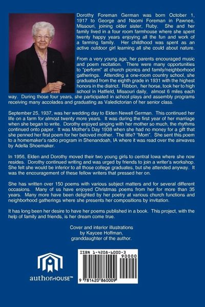 Dorothy Foreman German was born October 1, 1917 to George and Naomi Foreman in Pawnee, Missouri, joining older sister, Ruby. She and her family lived in a four room farmhouse where she spent twenty happy years enjoying all the fun and work of a farming family. Her childhood was spent as an active outdoor girl learning all she could about nature. From a very young age, her parents encouraged music and poem recitation. There were many opportunities to "perform" at church picnics and family/ neighborhood gatherings. Attending a one-room country school, she graduated from the eighth grade in 1931 with the highest honors in the district. Ribbon, her horse, took her to high school in Hatfield, Missouri daily, almost 6 miles each way. During those four years, she participated in school plays and assembly programs receiving many accolades and graduating as Valedictorian of her senior class. September 25, 1937, was her wedding day to Elden Newell German on September 25, 1937. This continued her life on a farm for almost twenty more years. It was during the first year of her marriage when she began to write. Dorothy enjoyed singing with her mother so much, the rhythms continued onto paper. It was Mother's Day 1938 when she had no money for a gift that she penned her first poem for her beloved mother. The title? "Mom". She sent this poem to a homemaker's radio program in Shenandoah, IA where it was read over the airwaves by Adella Shoemaker. In 1956, Elden and Dorothy moved their two young girls to central Iowa where she now resides. Dorothy continued writing and was urged by friends to join a writer's workshop. She felt she would be inferior to all those college graduates, but she attended anyway. It was the encouragement of these fellow writers that pressed her on. She has written over 150 poems with various subject matters and for several different occasions. Many of us have enjoyed Christmas poems from her for more than 35 years. Many more hav