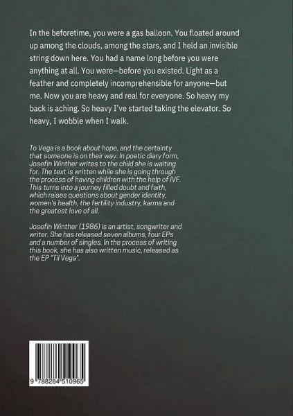 To Vega is a book about hope, and the certainty that someone is on their way. In poetic diary form, Josefin Winther writes to the child she is waiting for. The text is written while she is going through the process of having children with the help of IVF. This turns into a journey filled doubt and faith, which raises questions about gender identity, women's health, the fertility industry, karma and the greatest love of all.