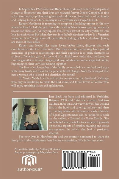 In September 1997 Isobel and Rupert bump into each other in the departure lounge at Heathrow and their lives are changed forever. Isobel Campbell is free at last from work, a philandering husband and the emotional ballast of her family and is flying to Venice for a holiday in a city which she's longed to visit. Rupert Northcote is returning to complete a building project in the city where he lives for half the year. Since the death of his wife two years ago work has become an obsession. As they explore Venice their love of the city crystallizes into love for each other. But when they run into Isobel's ex-sister-in-law in a Venetian restaurant it isn't long before all the family, including Isobel's ex-husband James, are aware of their affair. Rupert and Isobel, like many lovers before them, discover that each can illuminate the life of the other. But they are both recovering from painful memories of previous relationships and their euphoria is as easily shattered as a piece of Venetian glass. At the end of a blissful two weeks they are forced to run the gauntlet of family intrigue, jealousy, interference and unexpected events, beginning on their very last evening together. The lives of each member of the family are revealed in a multi-plotted story with many twists and turns. In the process Isobel changes from the wronged wife into a woman who is loved and cherished for herself. To Venice With Love is written for everyone on the threshold of change who may be hesitating to make the next move and for all lovers of Venice who will enjoy revisiting its art and architecture.