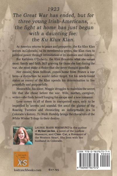 1923: The Great War has ended, but for three young Irish-Americans, the fight at home has just begun with a daunting foe: the Ku Klux Klan. As America returns to peace and prosperity, the Ku Klux Klan arrives in Colorado. As its membership grows, the Klan rises to political power through intimidation of its enemies and violence. For Kathleen O'Doherty, the Klan threatens what she values most: family and faith. Still grieving for those she lost during the war, she must make a choice that she never thought possible. Her cousin, Sean Sullivan, comes home from France a war hero-a distinction he would rather forget. Yet his newly-found status as enemy of the Klan upends his determination to live peacefully and purposefully. Meanwhile, his sister, Maggie struggles to maintain the secret life that she chose before the war. Wife, mother, caregiver, writer-she finds herself longing for escape and a new romance. Love comes to all of them in unexpected ways, only to be imperiled by secrets and scandal. Set amid the glamor of the Roaring Twenties and chronicling an unforgettable era in Colorado's history, To Walk Humbly brings the characters of the White Winter Trilogy to their destiny.