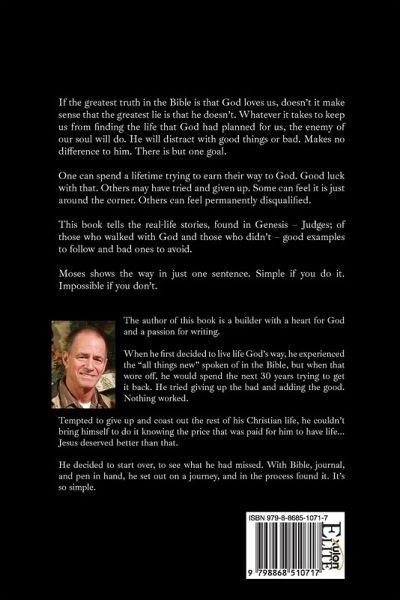 If the greatest truth in the Bible is that God loves us, doesn't it make sense that the greatest lie is that he doesn't. Whatever it takes to keep us from finding the life that God had planned for us, the enemy of our soul will do. He will distract with good things or bad. Makes no difference to him. There is but one goal. One can spend a lifetime trying to earn their way to God. Good luck with that. Others may have tried and given up. Some can feel it is just around the corner. Others can feel permanently disqualified. This book tells the real-life stories, found in Genesis - Judges; of those who walked with God and those who didn't - good examples to follow and bad ones to avoid. Moses shows the way in just one sentence. Simple if you do it. Impossible if you don't.